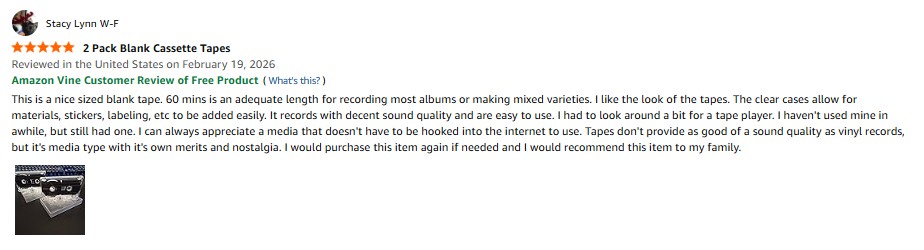I purchased the Dranvosk 2 Pack Blank Cassette Tapes 60 Minutes Clear Audio Recording Tape with Plastic Storage Case for Music Speech Collectors from Amazon and it was delivered in a timely fashion. This is a nice sized blank tape. 60 mins is an adequate length for recording most albums or making mixed varieties. I like the look of the tapes. The clear cases allow for materials, stickers, labeling, etc. to be added easily. It records with decent sound quality and are easy to use. I had to look around a bit for a tape player. I haven’t used mine in awhile, but still had one. I can always appreciate a media that doesn’t have to be hooked into the internet to use. Tapes don’t provide as good of a sound quality as vinyl records, but it’s media type with it’s own merits and nostalgia. I would purchase this item again if needed and I would recommend this item to my family. amazon listing.