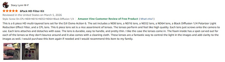 I purchased the K&F CONCEPT 6Pack HD Filter Kit Compatible with DJI Osmo Action 6 , CPL ND8 ND16 ND32 ND64 Black Diffusion 1/4 Polarizer Light Reduction Effect Filter HD Optical Glass with Multi-Layer Nano-Coating from Amazon and it was delivered in a timely fashion. This is a K&F CONCEPT 6 piece HD multi-layered lens set for the DJI Osmo Action 6 Camera. The set includes a ND8 lens, a ND16 lens, a ND32 lens, a ND64 lens, a Black Diffusion 1/4 Polarizer Light Reduction Effect Filter, and a CPL lens. This 6 piece lens set is a nice assortment of lenses. The lenses perform and feel like high quality. Each lens just screws onto the camera to use. Each lens attaches and detaches with ease. The lens is durable, easy to handle, and pretty thin. I like the case the lenses come in. The foam inside has a spot carved out for each of the lenses so they don’t bounce around and it also comes with a cleaning cloth. These lenses are a fantastic way to control the light in the images and add clarity to the images as well. I would purchase this item again if needed and I would recommend this item to my family. amazon listing.