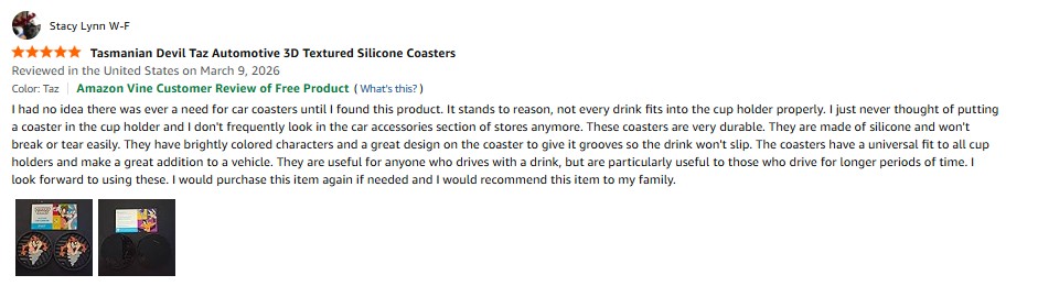 I purchased the NJECT Officially Licensed Looney Tunes Tasmanian Devil Taz Automotive 3D Textured Silicone Coasters (2.75″ Diameter) | Universal Fit for All Cars, Trucks, SUVs & More | Non-Slip Durable | Set of 2 from Amazon and it was delivered in a timely fashion. I had no idea there was ever a need for car coasters until I found this product. It stands to reason, not every drink fits into the cup holder properly. I just never thought of putting a coaster in the cup holder and I don’t frequently look in the car accessories section of stores anymore. These coasters are very durable. They are made of silicone and won’t break or tear easily. They have brightly colored characters and a great design on the coaster to give it grooves so the drink won’t slip. The coasters have a universal fit to all cup holders and make a great addition to a vehicle. They are useful for anyone who drives with a drink, but are particularly useful to those who drive for longer periods of time. I look forward to using these. I would purchase this item again if needed and I would recommend this item to my family. amazon listing.