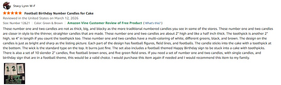 I purchased the THAMSPORO Football Birthday Number Candles for Cake , Glitter Football Birthday Cake Topper for Football Birthday Party Decoration, Candle for Football Birthday Cake Decoration (Number 12&21) from Amazon and it was delivered in a timely fashion. These number one and two candles are not as thick, big, and blocky as the more traditional numbered candles you see in some of the stores. These number one and two candles are closer in style to the thinner, straighter candles that are made. These number one and two candles are about 2″ high and like a half inch thick. The toothpick is another 2″ high, so 4″ in length if you count the toothpick too. These number one and two candles have a multi-coloring of white, different greens, black, and brown. The design on the candles is just as bright and sharp as the listing picture. Each part of the design has football figures, field lines, and footballs. The candle sticks into the cake with a toothpick at the bottom. The wick is the standard type on the top. It burns just fine. The set also includes a football themed Happy Birthday sign to be stuck into a cake with toothpicks. There is also a set of 10 slender 2″ candles, five football brown ones, and five green field ones. If you need a set of number one and two candles, with single candles, and birthday sign that are in a football theme, this would be a valid choice. I would purchase this item again if needed and I would recommend this item to my family. amazon listing.