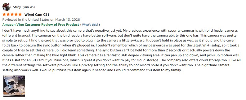 I purchased the eufy Wired Cam C31 , 360° Coverage with Pan and Tilt, Indoor and Outdoor, Dual Antenna, Color Night Vision, Local Storage, No Monthly Fee, AI Human/Vehicle/Pet/Cry Detection, 24/7 Continuous Recording from Amazon and it was delivered in a timely fashion. I don’t have much anything to say about this eufy Wired Cam C31 camera that’s negative just yet. My previous experience with security cameras is with bird feeder cameras (different brands). The cameras on the bird feeders have better software, but don’t quite have the camera ability this one has. This camera was pretty simple to set up. I find the cord that was provided to plug into the camera a little awkward. It doesn’t hold in place as well as it should and the cover folds back to obscure the sync button when it’s plugged in. I couldn’t remember which of my passwords was used for the latest Wi-Fi setup, so it took a couple of tries to set this camera up. I did learn something. The sync button can’t be held for more than 2 seconds or it actually powers down the camera rather than making the blue light blink. This camera has a fantastic 360 degree viewing area, it can pan up and down, and picks up motion well. It has a slot for an SD card if you have one, which is great if you don’t want to pay for cloud storage. The company also offers cloud storage too. I like all the different settings the software provides, like a privacy setting and the ability to not record noise if you don’t want too. The nighttime camera setting also works well. I would purchase this item again if needed and I would recommend this item to my family. amazon listing.