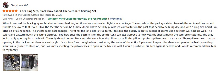 I purchased the Nesker 7 Pcs Comforter Set King Size, Black Gray Rabbit Checkerboard Bedding Set for Kids and Adults, Wonderland Heart Vintage Bed Sheet Sets with Fitted Sheet 2 Pillowcases & 2 Shams from Amazon and it was delivered in a timely fashion. When I received the black gray rabbit checkerboard bedding set it was vacuum-sealed tightly in a package. The outside of the package stated to wash the set in cold water and tumble dry low to fluff it out. I like the fact the set can be tumble dried. I have actually purchased comforters in the past that need to be hung dry, and with a king size bed it is a little bit of a challenge. The sheets seem soft enough. The fit for the king size is true to fit. I feel like the quality is pretty decent. It seems like a set that will hold up well. The colors and pattern match the listing pictures. I like how crisp the pattern is on the comforter. I can also appreciate how well the sheets match the comforter coloring. The gray looks really good against the black. The only thing I do not like about this set is how the pillow cases fit the pillow. I prefer a pillowcase that’s a sack. These pillow cases have an opening in the back rather than in a sack style. It’s a minor flaw though when considering the value of the entire 7 piece set. I expect the shams to open in the back since they aren’t usually used to sleep on, but I was not expecting the pillow cases to open in the back as well. I would purchase this item again if needed and I would recommend this item to my family. amazon listing.