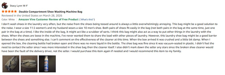 I purchased the Hyefiomo Double Compartment Shoe Washing Machine Bag for Sneakers , Chenille Microfiber Shoe Laundry Bag, Durable Mesh Shoe Bag for Washer & Dryer, Sneaker Cleaner for Running Tennis Kids Shoes (White) from Amazon and it was delivered in a timely fashion. I don’t wash shoes in the laundry very often, but the noise from the shoes being tossed around is always a little overwhelmingly annoying. This bag might be a good solution to the noise. I wear a size 11.5 women’s and my husband wears a size 10 men’s shoe. Both pairs of shoes fit easily in the bag (not both pairs in the bag at the same time, just one pair in the bag at a time). I like the inside of the bag, it might act like a scrubber of sorts. I think this bag might also act as a way to put other things in the laundry with the shoes. When the shoes are loose in the machine, I’ve never wanted them to share the load with other pieces of laundry. However, this laundry shoe bag might be a good barrier between the shoes and something else. I can’t comment on the effectiveness of the cleaner at this time. When the box arrived it was crushed and a little bit damp. When I opened the box, the cleaning bottle had broken open and there was no more liquid in the bottle. The shoe bag was fine since it was vacuum-sealed in plastic. I didn’t feel the need to contact the seller since I was more interested in the shoe bag then the cleaner itself. I also didn’t mark down the seller any stars since the broken shoe cleaner would have been the fault of the delivery driver, not the seller. I would purchase this item again if needed and I would recommend this item to my family. amazon listing.