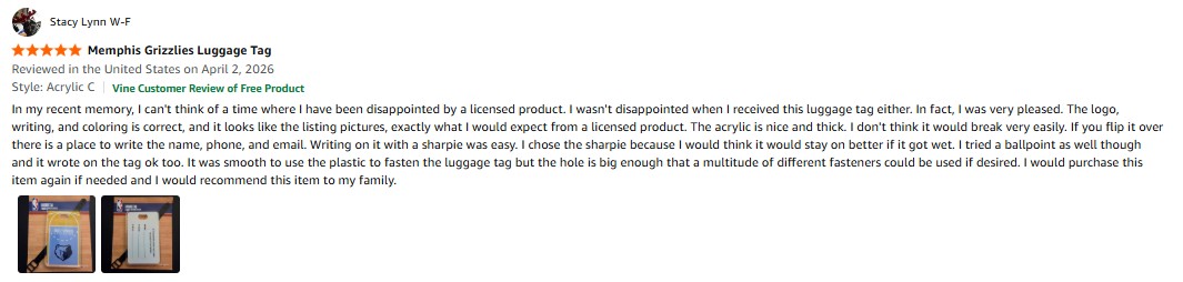 I purchased the Desert Cactus Memphis Grizzlies Luggage Tag – Official NBA National Basketball Travel ID Label for Suitcases, Bags, and Carry-Ons (Acrylic Luggage Tag C) from Amazon and it was delivered in a timely fashion. In my recent memory, I can’t think of a time where I have been disappointed by a licensed product. I wasn’t disappointed when I received this Desert Cactus Memphis Grizzlies Luggage Tag either. In fact, I was very pleased. The logo, writing, and coloring is correct, and it looks like the listing pictures, exactly what I would expect from a licensed product. The acrylic is nice and thick. I don’t think it would break very easily. If you flip it over there is a place to write the name, phone, and email. Writing on it with a sharpie was easy. I chose the sharpie because I would think it would stay on better if it got wet. I tried a ballpoint as well though and it wrote on the tag ok too. It was smooth to use the plastic to fasten the luggage tag but the hole is big enough that a multitude of different fasteners could be used if desired. I would purchase this item again if needed and I would recommend this item to my family. amazon listing.