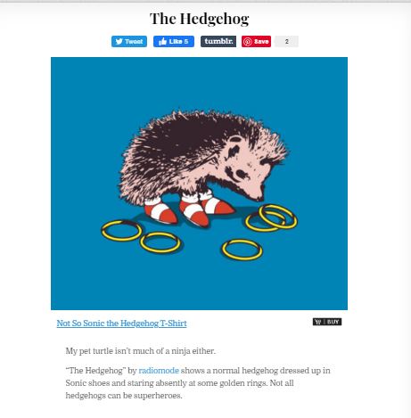 The Hedgehog – TShirtVortex “Not So Sonic the Hedgehog” T-Shirt My pet turtle isn’t much of a ninja either. “The Hedgehog” by radiomode shows a normal hedgehog dressed up in Sonic shoes and staring absently at some golden rings. Not all hedgehogs can be superheroes. Buy at DesignByHumans. Other Shirtigo or TShirtVortex posts: Beetlejuice Sandworm…